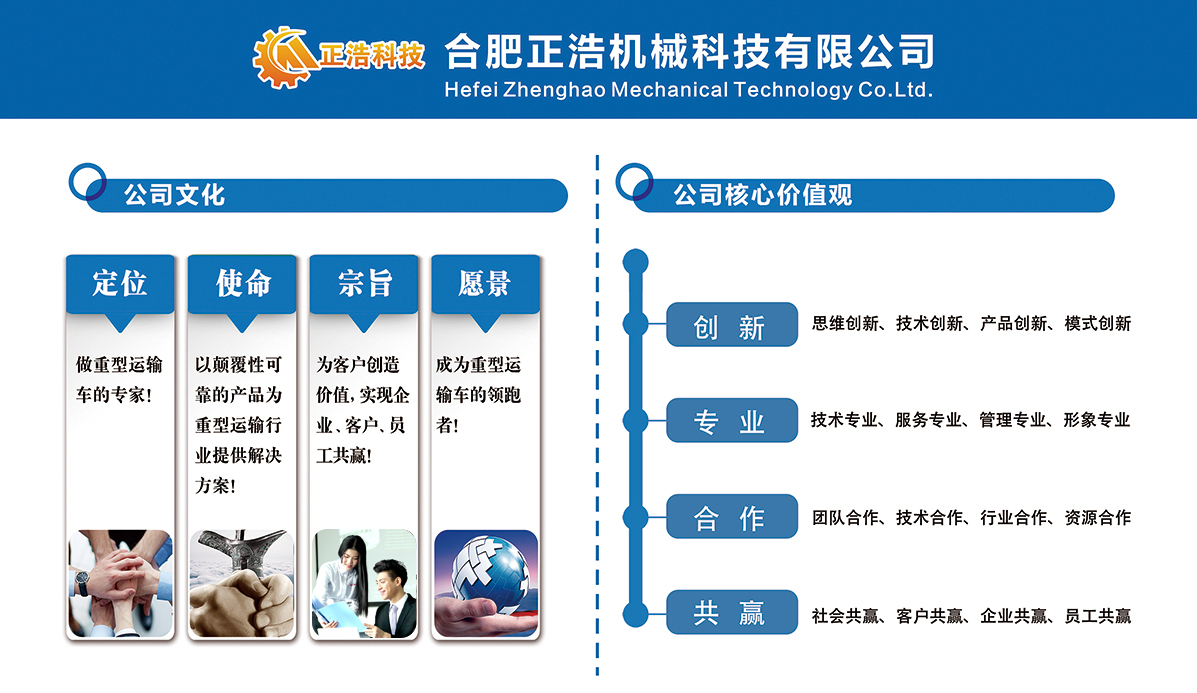 定位:做重型運(yùn)輸車的專家;使命:以顛覆性可靠的產(chǎn)品為重型運(yùn)輸行業(yè)提供解決方案;宗旨:為客戶創(chuàng)造價(jià)值,實(shí)現(xiàn)企業(yè)、客戶、員工共贏;愿景:成為重型運(yùn)輸車的領(lǐng)跑者。
